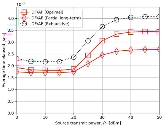 Figure 4 compares the average time elapsed among “DF/AF (Optimal)”, “DF/AF (Partial long-term)”, and “DF/AF (Exhaustive)” when increases. We conducted this experiment using Python 3.10 on 2023 MacBook Air 15 (Apple Inc., Cupertino, CA, USA) with Apple M2 processor including 4 cores of 3.49 GHz and the other 4 cores of 2.42 GHz. Both the proposed schemes have achieved notably lower time consumption compared to the exhaustive method. For instance, the running time gains of the optimal and partial long-term criteria over the exhaustive search are approximately 15% and 34%, respectively, at dBm, and 21% and 26% at dBm. We can thus conclude from Figure 3 and Figure 4 that the proposed schemes provide a satisfactory trade-off between performance and time complexity.