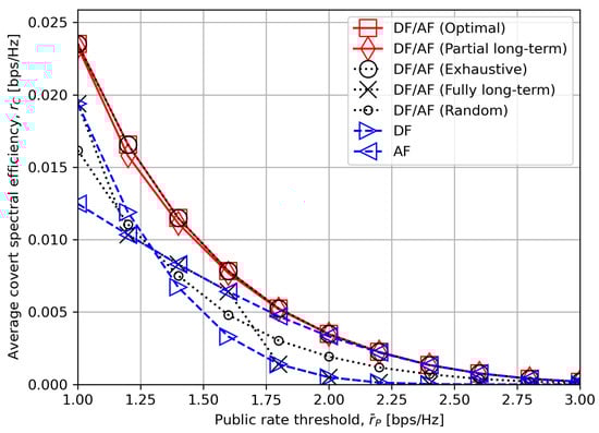 Figure 6 presents the average worst-case covert rate as the public rate threshold varies. Our proposed optimal and low-complexity mode selection schemes show considerable improvement than other compared ones for all ranges. For as an example, the optimal criterion gains 28% improvement at least over the other compared schemes. We note that “DF/AF (Fully long-term)” based only on the long-term statistics of channel even underperform the random mode selection, despite its negligible computational complexity. This highlights the decent trade-off between the complexity and performance by the proposed “DF/AF (Partial long-term)”.
