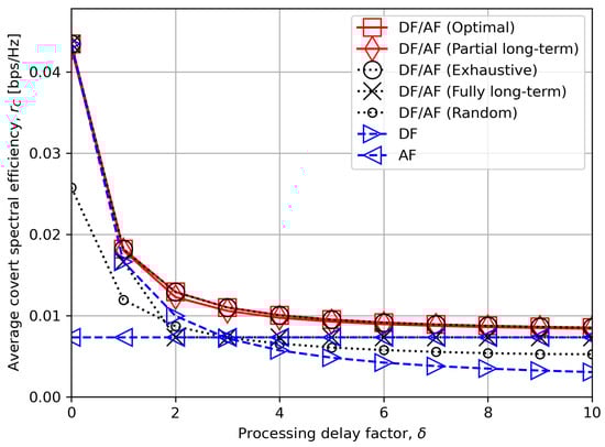 Figure 7 illustrates the average worst-case covert rate performance for different values of processing delay factor . The proposed optimal and low-complexity mode selection schemes mostly choose DF when is low and AF when is high as expected. Besides, both schemes make the best decision when is in an intermediate range. The performance gain of 50% is observed for the optimal criterion over the other compared schemes for . In contrast, “DF/AF (Fully long-term)” only with the long-term statistics of channel was not able to determine the best relay mode for non-extreme values of , which could be more common in practice.