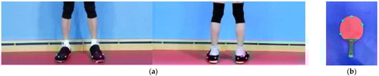 The kinematic data were captured using an infrared motion capture system (MC2000, ChingMu Inc., Shanghai, China), as shown in Figure 1. This system, consisting of 20 infrared cameras, is capable of providing real-time optical data and is widely used for motion capture and analysis. The system operates at an acquisition frequency of 100 Hz. A total of 15 reflective markers, each with a 14 mm diameter, were attached to the feet (Figure 2a) and the racket (Figure 2b).