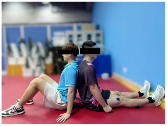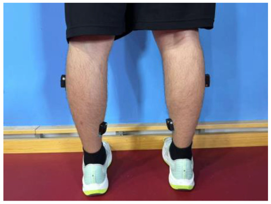 Participants were seated on a firm training mat with their feet fully pressed against the wall to maintain a relaxed and neutral position, ensuring the ankle joint was positioned at approximately a 90° angle [22]. The MVC test involved isometric contractions, ensuring that no joint movement occurred. During the test, participants were instructed to exert ‘as much force as possible’ [23] by performing a plantar flexion movement, engaging the posterior muscles of the lower leg, specifically the soleus (SOL) and gastrocnemius lateralis (GL). An assistant was present to ensure that the participants’ backs remained stationary and their knee joints stayed motionless, as shown in Figure 5. Each participant completed three sets of 5 s MVCs, with a 10 s rest interval between each set. None of the participants reported any pain or discomfort that would interfere with force production. The maximal EMG activity recorded for each muscle was selected to normalize the EMG signals throughout the entire fatigue task.
