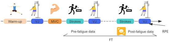 After the MVCs, participants were given a 10 min rest period. The fatigue task in this study followed the protocols performed in previous research [24,25]. Participants were required to perform a series of 20 forehand strokes, followed by three sets of vertical jumps (Figure 6). If the average height of the jumps exceeded 70% of the participant’s maximal vertical jump height (MH), they were instructed to proceed with another set of 20 forehand strokes.