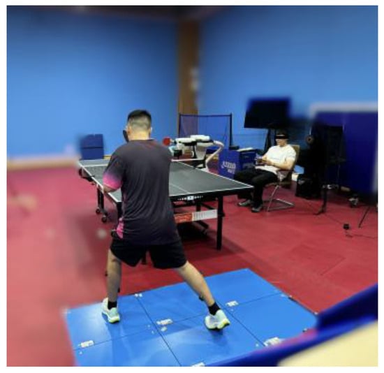 A jump device with a touch screen was used to measure the height of an athlete’s vertical and standing jumps, providing precise data on vertical jump performance. Additionally, a serving robot (PONGBOT M-ONE, Future-mind Inc., Shanghai, China) was employed in this study [21]. The PONGBOT M-ONE allowed for the flexible modification of key parameters such as ball speed (4–12 m/s), spin (0–80 rotations per second, including topspin and backspin), frequency (30–85 times per minute), and placement (any location on the table). This level of control created a controlled and adaptable training environment, facilitating a meticulous analysis of players’ reactions and enabling focused exploration of specific performance elements.