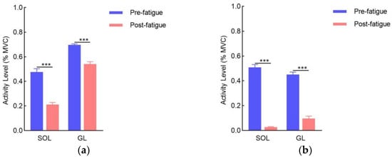Muscle activity level during the pre- and post-fatigue phases: (a) left leg; (b) right leg. SOL: soleus, GL: gastrocnemius lateralis; EMG signals were normalized to the muscle activity assessed during the maximal voluntary contraction (MVC); *** indicates significant differences between pre- and post-fatigue phases (p < 0.001).