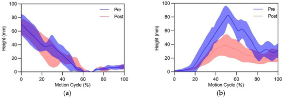Figure 9 depicts the trend of the heel height for each foot during the pre- and post-fatigue phases. The results show a consistent pattern for the left heel, with a decrease followed by an increase in height, reaching the lowest point at approximately 50% of the motion cycle. No significant difference in height was observed between the pre- and post-fatigue phases for the left heel. In contrast, the right heel exhibited an initial increase in height followed by a decrease, peaking around 50% of the motion cycle. Notably, Figure 9b shows a significant reduction in right heel height during the post-fatigue phase compared to the pre-fatigue phase, particularly from 20% to the end of the motion cycle.