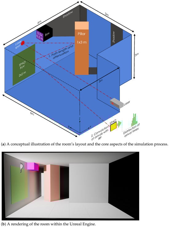 The SPAD-based dToF Lidar system is assumed to be co-located at a point in the corridor leading to the room shown in Figure 1a. The pulse laser illuminates a single point, referred to as the ‘laser hit point’ (the red dot in Figure 1a) [,]. Figure 1 also shows the implementation of the room within the Unreal game engine. In Figure 1b, the laser point is represented by the light bulb icon. The shadows visible in the Unreal environment are cast by this light source. Unfortunately, the lighting within the virtual environment is not sufficiently physical to be matched directly with real systems. The SPAD is assumed to be coupled to a lens system that images an area, i.e., a Field of View (FoV), as shown by the green square in Figure 1. This modeling scheme is compatible with both pixel array-type sensors [,,,,] and single-pixel sensors, such as SNSPDs []. Note that throughout this work a left-handed coordinate system is used. This is to maintain consistency with the Unreal engine, which also uses a left-handed coordinate system.
