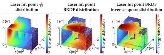 Figure 3 illustrates the distribution of the laser energy throughout the room to all observed points . For illustrative purposes, the room is sampled using a  grid of rays , resulting in  lookin points, with each lookin point sampling the room using  pixels for , resulting in a total of 360,000 observation points of the room. The left panel shows the inverse-square loss as the distance from the laser hit point increases. The center panel shows the energy distribution based on the BRDF associated with the laser hit point, which is assumed to be Lambertian, i.e., . The right panel shows the combined effects of the inverse-square loss and the BRDF. For Lambertian scattering, the arccos function from Equation (4) is effectively removed.