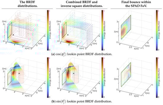 Figure 5 shows the steps in the primary scattering scheme for two lookin points shown as gray triangles. Figure 5a shows the energy distribution for a lookin point located on the nearest wall with a Lambertian BRDF, such that . Figure 5b shows the energy distribution for a lookin point located on the pillar face nearest the laser hit point. For illustrative purposes, the pillar has been assigned a BRDF of , which causes it to direct the majority of its energy into a plane parallel with the floor. Furthermore, the observed points from the pillar lookin have a ‘triangular’ shape as a result of the  FoV of the lookin combined with the angled surface upon which it has been spawned. The green square illustrates the FoV of the SPAD. The observation points that fall within the green square are used to calculate the final bounce back to the SPAD. The left panel shows the BRDF energy distributions from their respective lookin points. In comparison to the center panel of Figure 3, the left column of Figure 5a illustrates the same cosine distribution, although it has now been rotated to align with the surface normal of the lookin point. The center panel shows the effect of the inverse square scaling on the energy distributions. The right panel shows close-in views of the SPAD FoV. These panels also illustrate the relative scattering intensity of each observed point, including the final bounce calculation. Once the final bounce has been calculated, the likelihood envelope function  in time t associated with the primary paths can be written as the convolution of the path length and attenuation with an IRF, as follows: