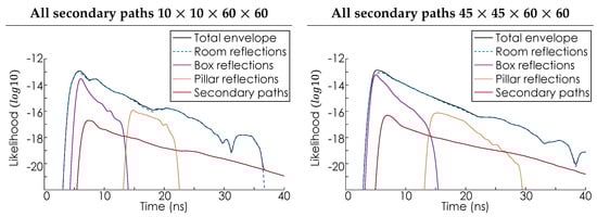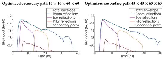 The panels show the likelihood envelope function  for the optimized secondary scattering mechanism, plotted on a log scale, for a  and a  sampling configuration, respectively. The likelihood envelope function  is the uppermost solid black line. The color−coded lines illustrate the contributions to the total envelope of each feature of the room. Specifically, the walls, roof, and floor (blue), the box (purple), the pillar (orange), and the secondary bounce (red).
