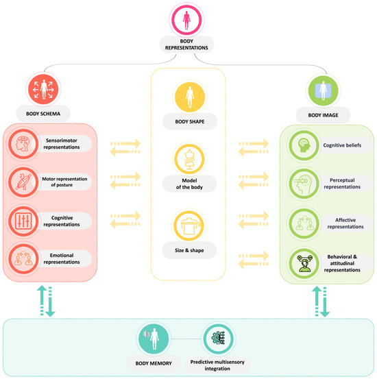 Autism spectrum disorder (ASD) stands as one of the most incapacitating developmental disorders, imposing a substantial economic burden on both patients and the healthcare system [1]. While the semantics of ASD remain a contentious topic in research, highlighting the importance of ongoing debate, the terminology employed in this article adheres to that traditionally used in the current literature. Any controversy surrounding it is beyond the scope of our discussion [2]. We define autistic individuals as part of the neurodiversity spectrum, diverging from neurotypical standards not as a disorder but as a representation of the natural variation within humanity [3]. They share certain characteristics, including distinct patterns in social communication and interaction, as well as restricted and repetitive behaviors, interests, or activities [4]. Accurately estimating the prevalence of ASD is crucial. Globally, 1 in 100 children [1] is autistic, and in the United States, approximately 5,437,988 individuals aged 18 and older are autistic [5]. The complex nature of their neurodiversity presents unique challenges for healthcare providers, educators, and caregivers in evaluating their abilities and, subsequently, delivering effective interventions and support services [6]. Within these challenges, clinicians often struggle to accurately assess opportunities and symptomatology and their nuanced yet profound impact on daily life, quality of life, and autonomy. Many autistic adults encounter significant difficulties related to daily life activities, such as personal hygiene, meal preparation, and money management [7,8], alongside more complex issues related to body representations (BRs) [9,10,11]. BR is an umbrella term encompassing both body schema and body image (Figure 1). Body schema refers to a precise sensorimotor representation of postural and structural bodily properties intended to guide the optimal planning and control of actions that are essential for coordinating movements and spatial awareness [12]. Conversely, body image is a multidimensional self-construct representing the visuospatial and conceptual representation of a broad range of bodily properties. Its aim is to describe the body and encompasses feelings of satisfaction or dissatisfaction with one’s physical appearance [12].