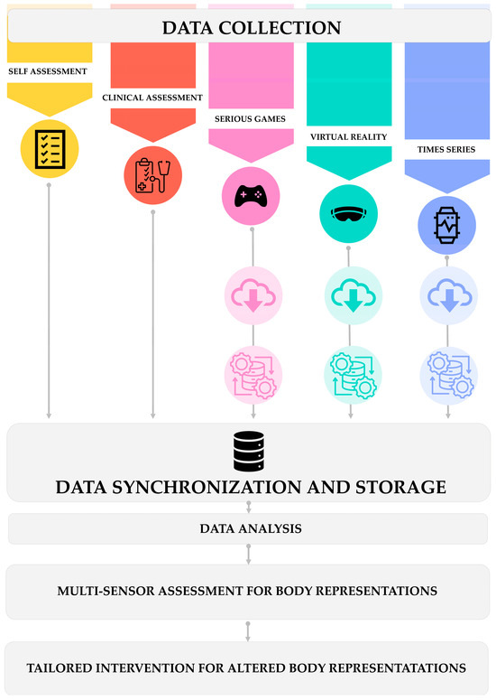 Based on the outlined data collection methods, we present our proposed methodology for setting up a proper framework to store, synchronize, and later analyze the data (Figure 3). We have implemented a state-of-the-art data integration platform that utilizes machine learning algorithms for data cleaning and transformation, ensuring compatibility across different device platforms and data formats. The platform features advanced algorithms for anomaly detection and correction, significantly reducing integration errors and improving the reliability of multisource data aggregation. This step is crucial for linking the technological aspects, such as the various sensor evaluations, with clinical applications and research. Developing such an integrated platform is essential for fully exploiting the potential of the collected data. Without such a platform, the analysis would be restricted to individual evaluations, limiting the opportunity to leverage the different evaluations performed to gain deeper insights into ASD.