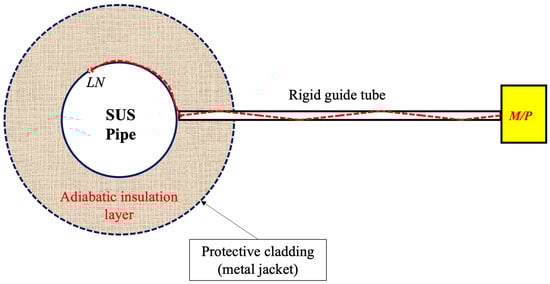 Figure 2 is a cross-sectional view of Figure 1. LN refers to the leakage nozzle, illustrating a single leak point connected to an M/P sensor via a rigid guide tube. The red dashed lines in the figure show the paths of the ultrasonic waves generated at the leakage nozzle as they propagate through the gap between the pipe and the insulation and are transmitted to the M/P sensor outside the insulation through the rigid guide tube.