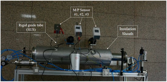 Side view of the experimental setup shown in Figure 3, illustrating the arrangement of the rigid guide tube, M/P sensors, and insulation sheath.
