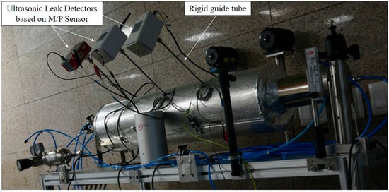 The experimental setup in Figure 3 and Figure 4 was constructed according to the design specifications outlined in Figure 1 and Figure 2. Specifically, the edge of the rigid guide tube was designed not to make direct contact with the pipe surface. This ensures that vibrations from the pipe are not transmitted through the rigid guide tube to the M/P sensors, allowing only the ultrasonic signals generated by leaks to be detected. This implementation prevents process noise, such as fluid-induced vibrations and cavitation occurring during normal operation of the nuclear plant, from reaching the M/P sensors, thereby enhancing leak detection sensitivity.
