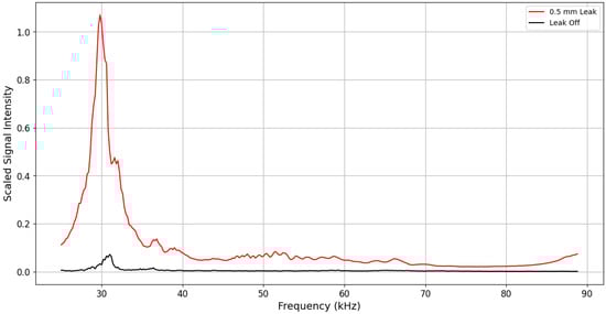 In this experiment, a 1.0 mm leak at the right-side leak point (LN #3) in the piping system shown in Figure 1 was conducted under a gauge pressure of 200 kPa. The experimental setup was similar to that of the experiment in Section 4.1, except that the air was discharged through a 1.0 mm nozzle, with the leakage process taking approximately 220 s. During this period, the ultrasonic signals were captured and averaged over this time span for each frequency band. When no leakage occurred, background noise was measured after ensuring that the compressed air had completely escaped from the pipe, and the average values were calculated over a subsequent 180 s, which was deemed sufficient for the background noise measurement. The frequency spectrum was analyzed by comparing the conditions with and without the leak event.