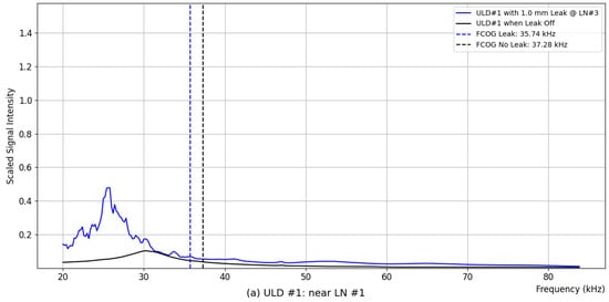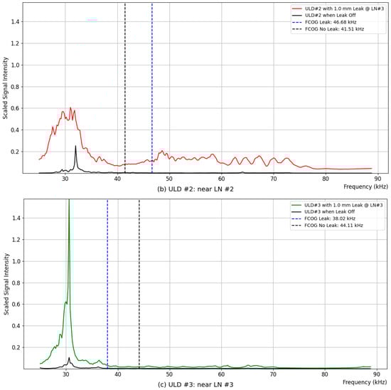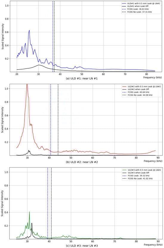 Figure 8 compares the ultrasonic sensing data measured by ULDs #1, #2, and #3 when there is a leakage and when there is no leakage at the location of LN #3. (a) shows the ultrasonic intensity captured by ULD #1, positioned to the left of the leakage point, with and without the leakage. Similarly to the previous experiment, the audible range signals were filtered out to avoid overshadowing the ultrasonic frequencies. The ULD #1 sensor measured values in the range from 20 kHz to 83.8 kHz. The FCOG was calculated according to Equation (1). The FCOG during leakage was found to be 35.74 kHz, while it was 37.28 kHz when there was no leakage, resulting in a shift of 1.54 kHz. (b) presents the ultrasonic intensity captured by ULD #2, which is positioned between LN #1 and LN #3. The ultrasonic sensor of ULD #2 was set to measure frequencies from 25 kHz to 88.8 kHz, excluding the audible range during the signal processing stage. The FCOG during the leakage was 46.68 kHz, compared to 41.51 kHz in the absence of leakage, resulting in a shift of 5.17 kHz. (c) displays the ultrasonic intensity recorded by ULD #3, located closest to the leakage point LN #3. The measurement range for ULD #3 was identical to that of ULD #2, covering the frequency range from 25 kHz to 88.8 kHz. The FCOG was 38.02 kHz during the leakage and 44.11 kHz without leakage, showing a shift of 6.09 kHz.