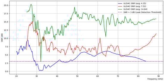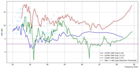 According to the proposal in Criterion 2, we set the threshold S/N ratio to 2, which corresponds to 3 dB when converted to decibels, as indicated by the purple dashed line in the figure. The SNR observed at ULD #3 exceeded 3 dB across the entire frequency spectrum except one point (probably a glitch), clearly indicating its proximity to the leakage point. Meanwhile, ULD #1 exceeded the 3 dB threshold in more than 80% of the spectrum, reflecting its position relative to the leak. ULD #2, despite having a lower average SNR, consistently maintained an SNR above the 3 dB threshold across the entire frequency range. These results suggest that, while all three sensors successfully detected the leakage, the highest average SNR observed at ULD #3 strongly indicates that the leak source was closest to this sensor. The consistency of SNR values above the threshold at ULD #2 further supported the detection of the leak, but the higher SNR at ULD #3 was critical in determining the leak’s precise location. This experimental observation aligns with Criterion 2, where the sensor with the highest SNR is likely closest to the leak, providing a reliable method for both detecting and localizing the leak.
