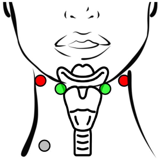In this study, we employ BI and EMG measurements recorded with the PhysioSense device developed by Nahrstaedt et al. [], utilizing a four-electrode setup, originally proposed by Yamamoto et al. [], extended with a reference electrode. Figure 1 illustrates the electrode positions. The electrodes placed on the sternocleidomastoideus close to the ear on both sides of the neck inject a current, and two electrodes placed laterally to the larynx between the hyoid bone and the thyroid cartilage measure the voltage over the enclosed tissue. The bioimpedance is the absolute value of the transfer impedance at a frequency of 50 regarding the voltage measured over the larynx and the inserted sinusoidal current.