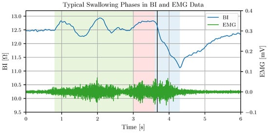 BI and EMG measurement of a saliva swallow. The swallow preparation phase (green background) shows some variation in the BI data caused by tongue movements from collecting saliva. The oral swallowing phase (red background) displays a small peak in the BI data, which continuously transitions to the BI swallow valley caused by the larynx elevation during the pharyngeal swallowing phase (blue background). The vertical line defines the time of the swallow onset marked by an expert, shortly after the start of the pharyngeal swallowing phase.