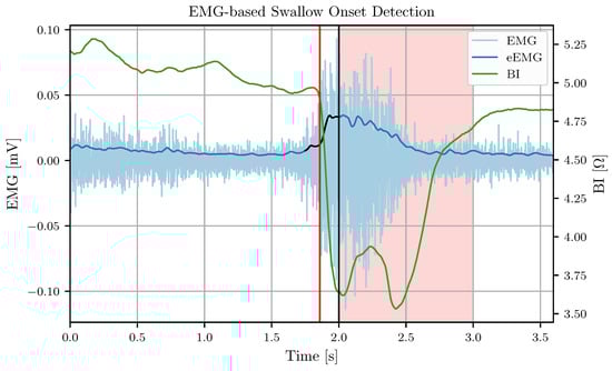 A visualization of the cleaned EMG (EMG), the envelope EMG (eEMG), and the BI of a single swallow for EMG-based swallow onset detection. The black section of the eEMG trace highlights the w samples of eEMG that exceed . The red vertical line denotes the manually marked swallow onset, while the black vertical line denotes the time of the detected swallow onset. The light red area marks the period with disabled onset detection that starts at a detected onset.
