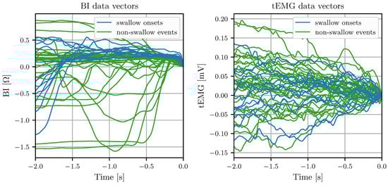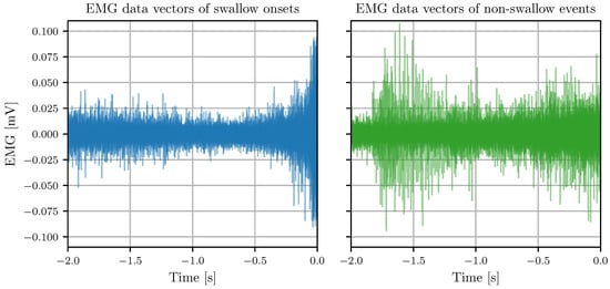 To date, techniques for swallow onset detection have employed EMG measurements at the throat [,,], a combination of EMG and BI measurements [], and measurement of the acceleration of the larynx [,]. EMG measurements taken at the throat usually show activation during swallow preparation []. Onsets of active EMG occur on average before the reflexive oral swallowing phase []. All reviewed techniques for the detection of swallow onsets require manual parameter tuning and lack a systematic analysis of the detection quality and timing using a comprehensive database including dysphagia patients.