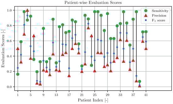 equals the sample number M of the downsampled EMG data vector minus the excluded samples , the false EMG onsets , the false negatives FN, the true EMG onsets , the skipped samples , and excluded samples at the start of an EMG measurement defined by the maximum of w or . Finally, the confusion matrix enables the calculation of evaluation scores, such as sensitivity, precision, and score for the subjects.