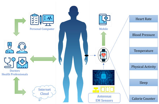 Figure 1. Role of antennas and EM sensors in biomedical applications and wireless health monitoring.