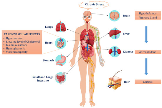 Cardiovascular diseases (CVDs) are prime contributors to elevating mortality rates and augmenting health complications worldwide. There are numerous factors accountable for the consequential growth of cardiovascular diseases, like chronic stress, high blood pressure, high cholesterol, obesity, physical inactivity, and diabetes. Recently, the investigation of the role of chronic stress in cardiovascular diseases is attracting significant attention, due to its catastrophic effects on both mental and physical health. Negative emotional states like stress, anxiety, and depression can trigger cardiovascular effects independently of classical risk factors (hypertension, adiposity, diabetes, and physical inactivity), further escalating the risk of cardiovascular diseases [28,29,30]. The HPA axis (hypothalamic pituitary adrenal axis) is a fundamental stress-response system in humans, with the paramount function of facilitating successful adaptation and maintaining equilibrium with the external environment. The HPA axis activates in response to chronic stress, sending a message to the hypothalamus, further stimulating the production of adrenocorticotropic hormones (ACTH) from the pituitary gland. These hormones prompt the adrenal gland in the kidneys to release glucocorticoids including cortisol (the end product of this cycle). An elevated level of cortisol contributes to various health conditions, like hypertension, insulin resistance, hyperglycemia, and obesity. The cardiovascular effects of chronic cortisol exposure can be evaluated by cortisol measurements in body fluids (saliva, blood, sweat, and urine) and human hair [28,29,30,31]. The process of cortisol development and its effects are illustrated in Figure 2. Measurement of cortisol in hair offers various advantages over other specimens, being a non-invasive, low burden, and single-sample measurement. Hair samples are collected from the posterior side of the head, close to the scalp, and methanol is added, to extract cortisol during an overnight incubation (16 h) at 52 °C. The methanol is then transferred into a clean glass container and is evaporated until completely dry. The samples are then dissolved in PBS (phosphate buffer saline) with a pH value of 8.0 and mixed thoroughly. Cortisol levels in the hair extracts are then measured, using a commercial kit, also used for measurement of salivary cortisol in which a cortisol standard is available to generate a standard curve for the assay, and all samples are read off a user-generated standard curve [28,29,30,31].
