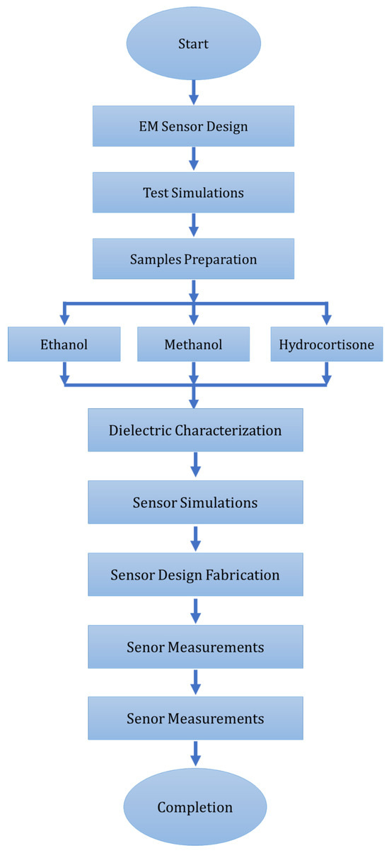 In short, numerous novel configurations of the microwave resonator and sensors have been investigated for microfluidic chemical and healthcare applications. Cavity resonator-based sensing devices have been investigated, to address the obstacle of lower accuracy, but these devices are expensive and require complicated experimental setups, making them incompatible with practical industry applications [32,33,34]. Dielectric characterization has been achieved, using complementary split-ring resonators (CSRR) coupled with a microstrip line, where liquid samples are contained in a polydimethylsiloxane (PDMS) channel in the sensitive region of a sensing device. Microfluidic channels built using polymers have been extensively investigated for dielectric characterization and liquid sensing, but fabrication and integration of these channels requires a complicated and delicate procedure for better results [35,36,37]. The submersible technique has been proposed in various investigations, in which submersible resonator structures are utilized for dielectric characterization and liquid sensing in the microwave frequency regime [38,39,40]. SRR and CSRR topologies in sensing devices are deterministic and practical for microfluidic sensing and for chemical and biomedical applications, due to their distinctive features and unique resonance characteristics [32,33,34,35,36,37,38,39,40]. D. Barmpakos et al. investigated graphene-based inks for flexible inkjet printed sensors, for thermal applications with high repeatability and endurance in heating cycles. The approach was promising for fabrication on non-planar substrates for selectively heated geometries [41]. J. George et al. proposed an inkjet-printed electromagnetic sensor with silver ink and carbon nanotubes as conducting material fabricated on a paper substrate. The design was validated for a differential gas sensor based on variations in dielectric properties of sensitive composite material in the presence of ethanol vapors [42]. H. Jeong et al. investigated a polarization-insensitive optically transparent metamaterial absorber fabricated on a PET substrate using inkjet printing with 90% absorption happening in the bandwidth of 26.8 to 28.2 GHz [43]. In contrast to various methods of cortisol measurement discussed in the literature, an economical, compact, and flexible electromagnetic sensor was proposed for the measurement of hydrocortisone (chemical replacement of cortisol hormone from Sigma-Aldrich, regarded as a biomarker of chronic stress in cardiovascular diseases) along with concentration measurements of two chemicals (ethanol and methanol) by examining the variation in dielectric properties and changes in resonant frequency in response to change in concentration. Dielectric characterization of various solution samples was conducted, using a network analyzer and a dielectric probe kit. These dielectric measurements were further utilized to investigate and validate the sensitivity of the proposed sensor design in simulation and experimental measurements. A shift in the resonant-frequency metamaterial-based sensing structure distinguishes significant variation in dielectric properties. Outlined in Figure 3 is the flowchart illustrating the design process followed for the proposed sensor.