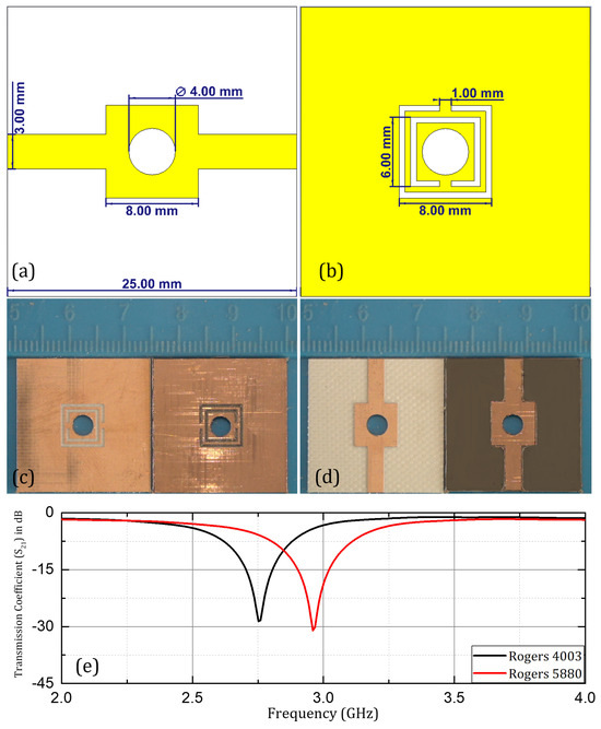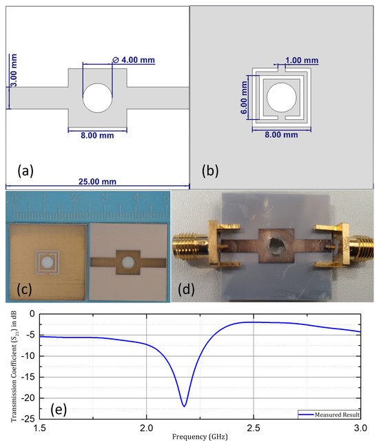 Figure 4. Proposed design: (a,b) front and back view with dimensions; (c,d) fabricated design; (e) measured transmission coefficient ( S 21 ).