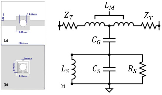 Figure 6. PET based sensor design with equivalent circuit model.(a,b) front and back view with dimensions; (c) equivalent circuit model ( L S = inductance of SRR, C S = capacitance of SRR, R S = resistance of SRR, C G = capacitance between ground plane and microstrip line, Z T = Impedance of microstrip line, L M = inductance of microstrip line).