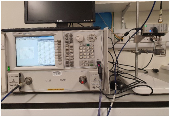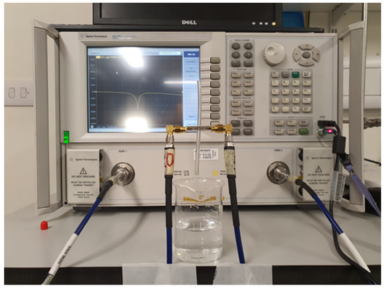 The dielectric properties (electrical permittivity) of the samples were measured using a PNA-L (N5230C) vector network analyzer (VNA) with a frequency range of 10 MHz–20 GHz and Agilent 85070 dielectric probe kit. An Agilent 85062B kit was used for electronic calibration before measurements using references of short, open air, and distilled water at 25 °C. This calibration is very crucial and plays a vital role in accurate dielectric measurements [47]. Five samples of each ethanol and methanol solution were prepared, ranging from 10% to 50% concentration with a step size of 10%. Ethanol and methanol both had a purity of more than 99% when used in the preparation of the samples. Similarly, five samples of hydrocortisone (obtained from Sigma-Aldrich, St. Louis, MO, USA) were prepared, which were 10 mg, 20 mg, 30 mg, 40 mg, and 50 mg in 200 mL of 75% methanol aqueous solution. The dielectric properties were measured in the frequency range of 0.5–5 GHz, using a calibrated network analyzer and a dielectric probe kit. The complete measurement setup for the dielectric properties’ measurement is shown in Figure 7.