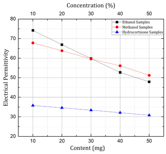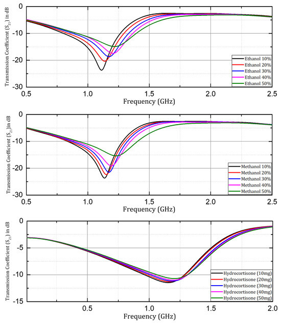 After the investigation of prototypes with the Rogers non-flexible substrates, the sensor structure with the PET substrate was investigated for microfluidic applications using ethanol and methanol samples in aqueous solutions, and for healthcare applications hydrocortisone samples were investigated. The transmission coefficient ( S 21 ) was investigated and is presented here with samples having concentrations of 10%, 20%, 30%, 40%, and 50% of ethanol and methanol, and samples of hydrocortisone (chemical derivative of human cortisol) with a quantity of 10mg, 20 mg, 30 mg, 40 mg, and 50 mg in 200 mL of 75% methanol solution. A significant shift in resonant frequency was observed when the concentration of respective organic solvents (ethanol and methanol) was changed in the aqueous solution samples. Similarly, in the case of the hydrocortisone samples the resonant frequency increased with an increase in the content of hydrocortisone, but it was not as significant as compared to the behavior shown by the organic solvent samples. The reason was that variation in the electrical permittivity is small with the change in the content of the hydrocortisone, as shown in Figure 12.