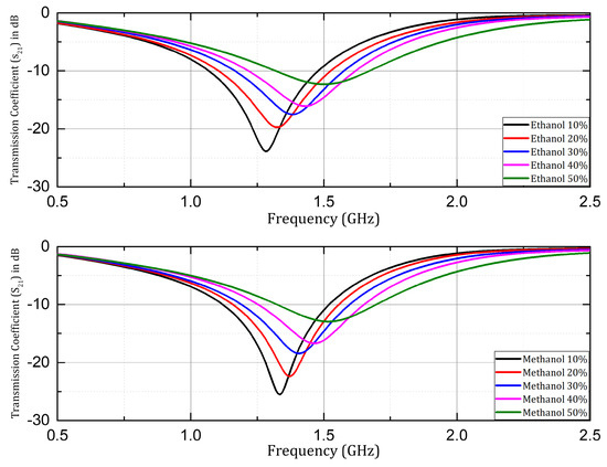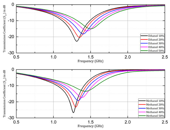 The sensor structure with Rogers RO4003C substrate was investigated for microfluidic applications, using ethanol, and methanol samples in aqueous solutions. The transmission coefficient ( S 21 ) was investigated, and is presented here with samples having concentrations of 10%, 20%, 30%, 40%, and 50% of ethanol and methanol. A significant shift in resonant frequency was observed when the concentration of the respective organic solvents (ethanol & methanol) was changed in the aqueous solution samples as shown in Figure 10. Similarly, in the case of the Rogers RT/Duroid 5880 substrate the resonant frequency increased with the increase in concentration by a step size of 10% in both cases of ethanol and methanol samples prepared in aqueous solutions as shown in Figure 11. Overall, in both cases of Rogers’ substrates, the trend of increasing resonant frequency with an increase in the concentration of organic chemicals (ethanol and methanol) remained the same throughout the experimentation process. The Q factor in the mentioned cases was non-linear with respect to change in concentration due to the non-linear loss function of the water mixture.
