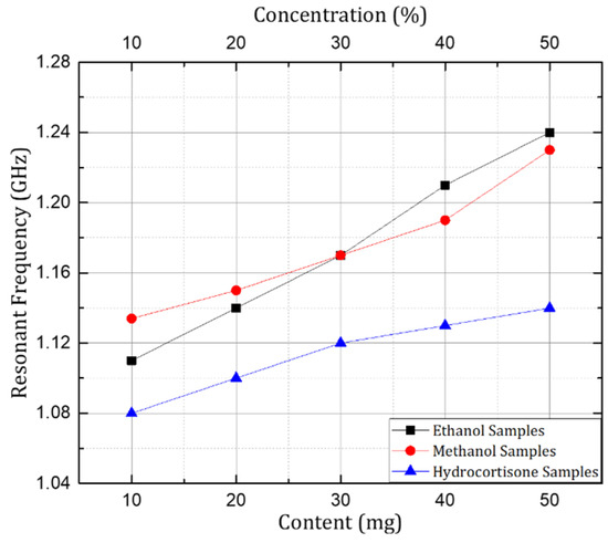 In short, the resonant frequency increased with the increase in the concentration of ethanol, methanol, and hydrocortisone in their corresponding samples. The trend remained the same throughout the experimentation process when the concentration of ethanol and methanol was changed from 10% to 50%. Similar behavior would be observed for further concentrations (60–100%) as there was linear variation in the dielectric properties for the samples with higher concentrations. Similarly, the same behavior was depicted by the sensor when the concentration of hydrocortisone was varied from 10 mg to 50 mg in the respective solution samples. The linear variation of frequency versus the concentration of the mentioned chemicals is shown in Figure 13. In the case of the 30% ethanol and 30% methanol samples, the resonant frequency was the same, due to the fact that both samples had the same electrical permittivity at the given frequency range, also explained in Figure 8.