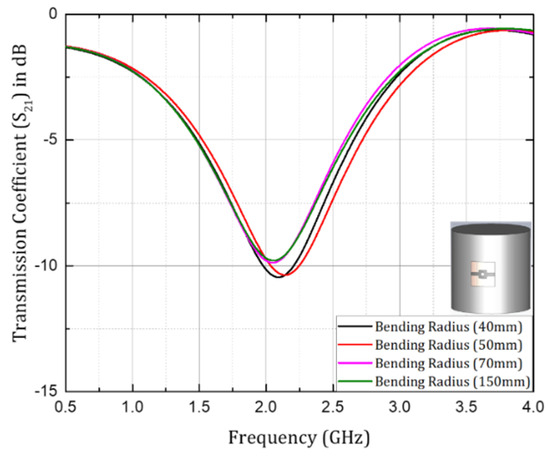 The sensor structure under investigation could be attached to the cylinder using Kapton tape for experimental measurements, to avoid extra physical stress on the connectors delicately bound using conductive epoxy. Variations in resonant frequency with change in the bending radius (the radius of the cylinder on which the sensor has been bent for investigation) in the transmission coefficient ( S 21 ) are depicted in Figure 14. The graph shows that the resonant frequency was quite similar in the case of the 70 mm and 150 mm bending radius. This was due to the fact that when the bending radius was increased beyond a certain level the structure started behaving like a planar structure and the response became consistent.
