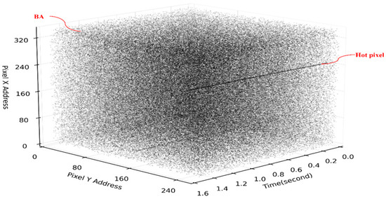 There are many challenges faced by event cameras in practical applications. For example, changes in the camera motion state and in the scene mean the event stream is not uniformly distributed over different periods, making it difficult to obtain clear and informative coherent event frames with traditional event stream visualization methods. Due to the high sensitivity of event cameras to changes in ambient brightness and junction leakage currents, there is an output even if there is no change in light intensity, called background activity (BA) [24], which affects the image quality, wastes communication bandwidth, and consumes unnecessary computational power. In high-speed operating environments and long exposures, event cameras experience hot pixels similar to conventional image sensors [25], where some pixels produce abnormal signals or offsets, which can cause these pixels to fail to reset correctly and continue to output events, called hot noise. Asynchronous events in an event camera capturing a rapidly changing scene are subject to a large amount of noise, which degrades the quality of the event data, blurs the event information in the event stream, and may even mask the true event signals. Traditional graph and video denoising methods are difficult to directly apply to event stream denoising, so there is an urgent need for efficient and feasible event stream denoising methods. Figure 1 shows the spatio-temporal visualization of the hot pixel noise and the background activity noise in a stream of events, with the X and Y axes representing the horizontal and vertical coordinates of the events, and the Taxis coordinates corresponding to the timestamps of the events. From the figure, it can be seen that the hot noise is parallel to the time axis and occurs continuously at a single pixel; the BA noise distribution is more random and sparser from the visualization.