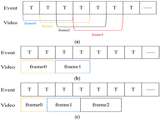 Asynchronous event stream information form is difficult to process, and a single event contains too little information, so the processing needs to aggregate events for processing. In addition, the event stream information is not intuitive for human eyes to observe, so it needs to be visualized to advance to the next step. Related work based on event camera visualization can be briefly divided into two categories: 1. For the event stream itself, through a fixed time window and other ways to obtain the event frame, which is convenient for further observation and application processing; and 2. image reconstruction of the event stream information, to obtain the estimated intensity of the image to achieve the effect of visualization. Xie et al. [33] proposed an overlap accumulation-based method to convert events with periods from 0 ms to 30 ms to frame 0 and events with periods from 10 ms to 40 ms to frame 1, as shown in Figure 2a. Although it makes the event information very rich, it also brings the problem of information redundancy or incoherent information in event frames, which is not conducive to real-time detection and monitoring. Chen et al. [34] proposed an event stream visualization scheme to achieve high and low frame rate adjustment and verified its effectiveness on the FPGA platform. However, the method reduces the amount of information contained in the event frames at high frame rates, and the information obtained during smooth motion is too little for further processing. In addition, the traditional fixed time interval approach divides the event stream into multiple sub-segments according to a fixed time window starting from the timestamp of the first event, and all events within each sub-segment are accumulated and projected to the event frame at the end of that sub-segment as shown in Figure 2b. The fixed number of events approach divides the event stream into multiple sub-segments by counting every N event starting from the first event, and all events within each sub-segment are accumulated and projected to the event frame at the end of the sub-segment, as shown in Figure 2c.