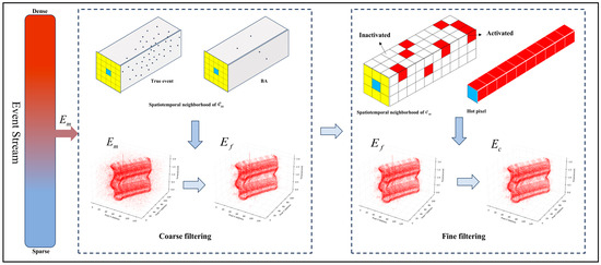 Proposed event stream denoising framework based on spatio-temporal density and time sequence analysis, where Em represents the unprocessed event stream, Ef represents the event stream that enters fine filtering after coarse filtering, and Ec represents the processed event stream. Blue for newly arrived events, yellow for their spatial neighborhoods, and red for pixels activated.