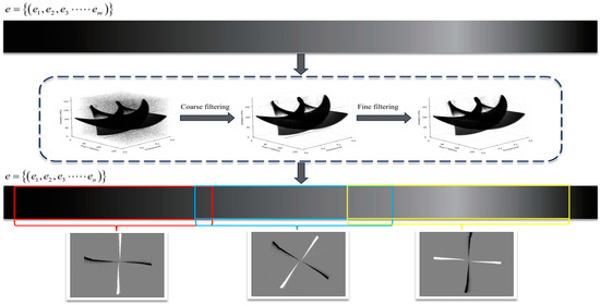 The noise processing and visualization process is shown in Figure 5. A set of event streams with uneven density distribution are filtered by coarse fine filtering, and then clear and coherent event frames are obtained based on the adaptive overlapping method. The event stream’s color represents the events’ density (black is the densest, and white is the sparsest). Different colors represent the events mapped to each event frame. The adaptive overlap method ensures flexible event quantity mapping and event overlap for each event frame.