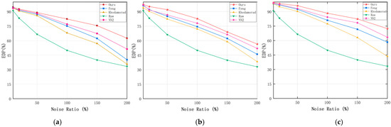 In this section of experiments, the method of this paper uses the parameters ms, ms, DT = 10, and . The parameter in the Feng filter is set to ms and the Khodamoradi filter parameter is set to 2 ms. Figure 7 and Figure 8 show the ESNR vs. EDP for the three datasets N−MNIST, CIFAR10−DVS, and MNIST−DVS.