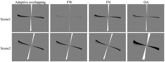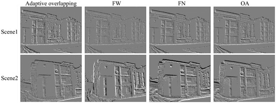 To verify and analyze the effect of event stream visualization, this section experiments on a real dataset as well as a public dataset. The real dataset uses the fast-rotating black-and-white turntable recorded in Section 4.1. As shown in Figure 9, the turntable rotates at a slower speed in Scene 1, and the event stream is sparse. The turntable rotates faster in Scene 2. The time stream is denser. The public event dataset was acquired by the Sensor Laboratory at ETH Zurich using a DAVIS 240C model event camera [38], with the urban part as the scene for the experiment as shown in Figure 10. In Scene 1, the motion state of the camera is smoother and the event stream is sparse. In Scene 2, the camera motion state is more violent and the event stream is denser. Table 4 shows the number of events in different scenes as well as time. The experiments compare four event frame formation methods: adaptive overlapping, fixed time window (FW), fixed number of events (FN), and overlapping accumulation (OA). The frame rate, the average number of events, and the variance of the number of events obtained by different visualization methods can reflect to a certain extent the uniformity of the information contained in the event frames, regardless of the intensity or slowness of the operation. Therefore, we use the above three indicators to evaluate the event frames obtained by different methods, as shown in Table 5 and Table 6.