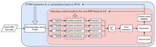 Following FVMD and GA, each suitable model corresponding to each decomposed IMF is employed as a predictor to create a prediction for its IMF. After that, all predictions are summed up to form the final prediction that is compared with the ground truth using RMSE. The fitness function for both WOA and GA, as defined by Equation (11), is