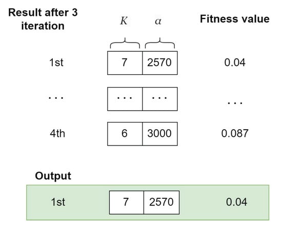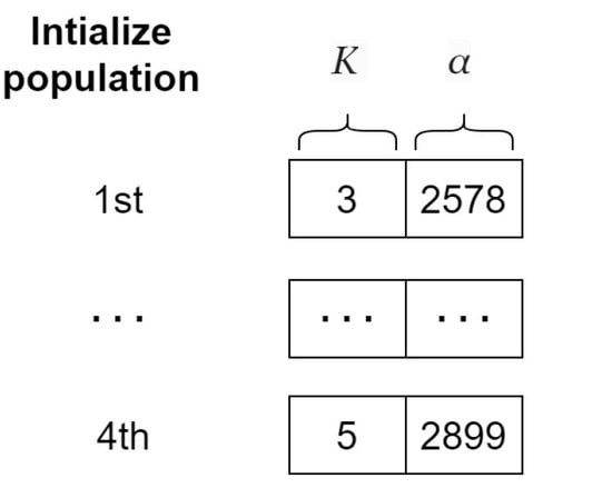 When utilizing VMD, the selection of appropriate values K and the parameter is pivotal, as these values significantly affect the accuracy of forecast outcomes [10,12,13]. Parameter K controls the number of output sub-sequences of the VMD, while alpha is the moderate bandwidth penalty constraint that controls the smoothness of each sub-sequence. A higher value of results in more narrow subsequences and is less prone to capturing noise. The previous studies have employed optimization algorithms, such as genetic algorithms (GA) [14,15], whale optimization algorithm (WOA) [16,17], and particle swarm optimization (PSO) [18,19], to fine-tune these parameters.