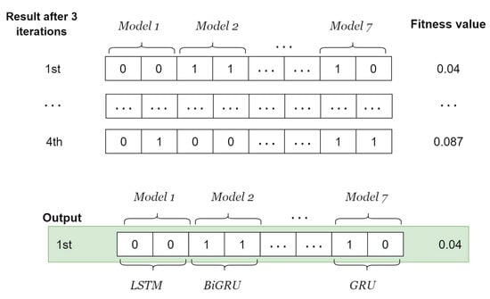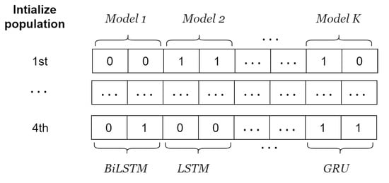 The fitness value is calculated by decomposing the traffic flow data into IMFs using FVMD, as illustrated in Figure 2, with derived from the whale population. The outputs of FVMD corresponding to each whale are IMFs. The GA processes these IMFs by selecting suitable models to generate corresponding predictions. The GA population consists of four individuals, each of which has genes. Specifically, every pair of genes shows the model for each IMF, as illustrated in Figure 5. These lists are then updated using the GA until the most suitable model is obtained. The list of candidate ML models is denoted as follows.
