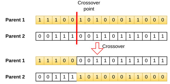 The GA involves three main operations: selection, crossover, and mutation. During selection, chromosomes are selected for reproduction based on their fitness, with those with higher fitness assigned a higher chance of becoming parents. These parents then undergo crossover to produce new offspring by exchanging segments of their chromosomes at randomly selected points. Figure 6 illustrates the process.