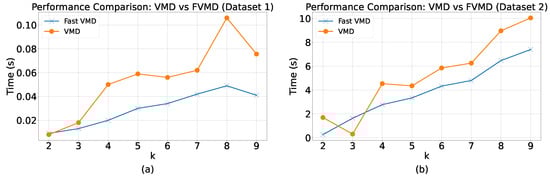 In addition, the original VMD framework is typically solved using the alternating direction method of multipliers (ADMM), which is a popular technique for distributed optimization owing to its numerous advantages, including a modular structure, straightforward implementation, excellent convergence, and flexibility [8]. Although ADMM has a convergence rate of , it might not be sufficiently quick in complex scenarios, resulting in time-consuming operations for the entire system [20]. Furthermore, optimization-based VMD is known to be highly time-consuming, as mentioned in [21,22]. Thus, the acceleration of VMD can lead to a decrease in resource usage and an improvement in overall performance.