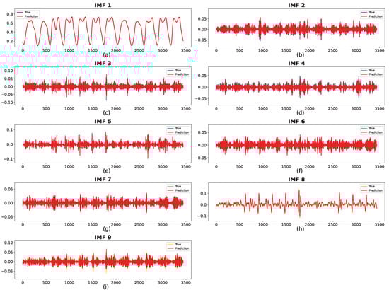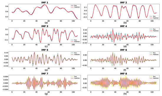 The prediction results for the two datasets are shown in Figure 14 and Figure 15, where the red curve indicates the predicted sequence. The actual curve is completely covered by the red curve, demonstrating the prediction accuracy of the proposed method for each IMF. In Figure 14, despite some bias at the extreme points for IMF4, IMF7, and IMF8, the overall patterns of the predicted and real values are closely aligned. For IMF1–IMF3, the forecasted values are remarkably consistent with the observed trends. In addition, as shown in Figure 15, the predictions for all subsequences are nearly identical to the ground truth.