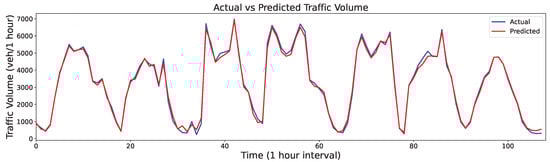 The final traffic volume output value was obtained by integrating the prediction results of all IMFs from Figure 14 and Figure 15, as shown in Figure 16 and Figure 17. Although the predictions exhibited some distortions at extreme points across the two datasets, they generally followed the trends of the actual values. Thus, the proposed FVMD-WOA-GA model demonstrated good prediction accuracy and robustness for both datasets, even when analyzing traffic volume data with dramatic fluctuations.
