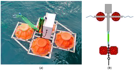 The surface units of the rigs at Austevoll. (a) The floating rig, seen from the research vessel. (b) Schematic drawing of the surface unit, showing the floaters (in red colour) (four on the surface, two at approx. 10 m depth). The grey unit contains the 4G transmitter and the batteries. The green and black lines are the connections between the units and to the lower parts of the rigs, where the sensors are (shown in Figure 2).